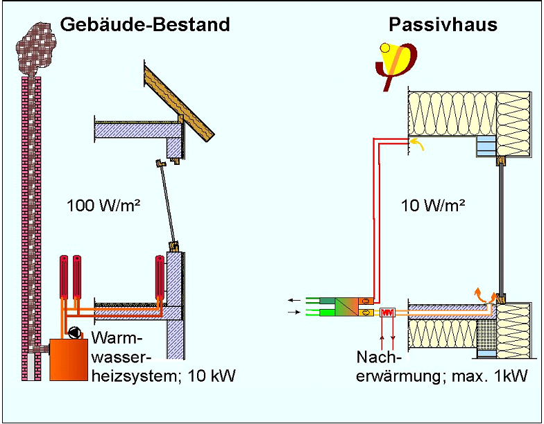 Dies kann in einfacher Weise veranschaulicht werden: Betrachtet man ein Wohnzimmer mit 20 m² Wohnfläche, so ergibt sich eine Spitzenlast von 140 Watt. Diese Wärmelast kann bequem von der fühlbaren Wärme eines Erwachsenen und eines Kindes bzw. der Leistung von zwei gewöhnlichen Glühlampen abgedeckt werden. Im Passivhaus bewegen sich die erforderlichen Energieströme wieder im natürlichen Bereich.