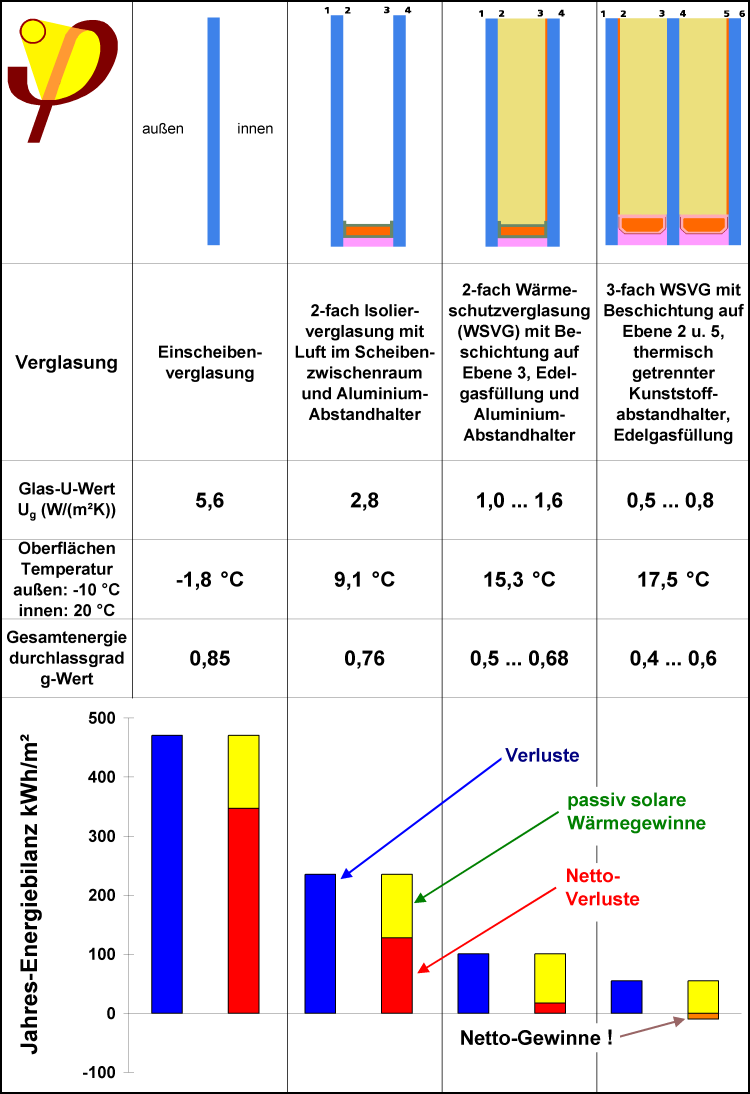 - Mit der Wärmeschutzverordnung von 1995 wurden 2-Scheiben-Wärmeschutzverglasungen (eine niedrigemittierende Beschichtung, Argon-Füllung) mit U = 1,5 W/(m²K) praktisch für alle Neubauten und Modernisierungen verbindlich. Diese Verglasungen waren aber immer noch nicht ausreichend für das Passivhaus: Die Temperaturen der Innenoberflächen können unter 14,5 °C liegen; daraus entstehen unbehagliche Strahlungstemperaturunterschiede und Zugerscheinungen, wenn nicht ein Heizkörper unter dem Fenster steht.