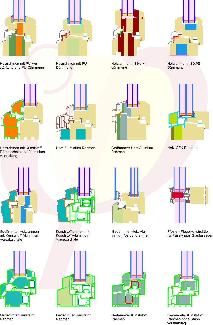 Gewöhnliche Fensterrahmen haben U-Werte von ca. 1,2 - 1,5 W/(m²K). Der Wärmeverlust eines Quadratmeters Rahmen ist etwa doppelt so hoch wie der der Dreifachverglasung. Eine bedeutende Wärmebrücke stellen die Abstandhalter der Verglasung dar, die meist noch aus Aluminium sind. Für das Passivhaus wurden daher besonders gut wärmedämmende Fensterrahmen entwickelt, die auch die Glasrandverluste durch einen tieferen Randeinstand und wärmedämmende Abstandhalter verringern. Abb. 6 zeigt eine Auswahl von Holz-, Holz-Alu- und Kunststoff-Rahmenschnitten verschiedener zertifizierter Hersteller.