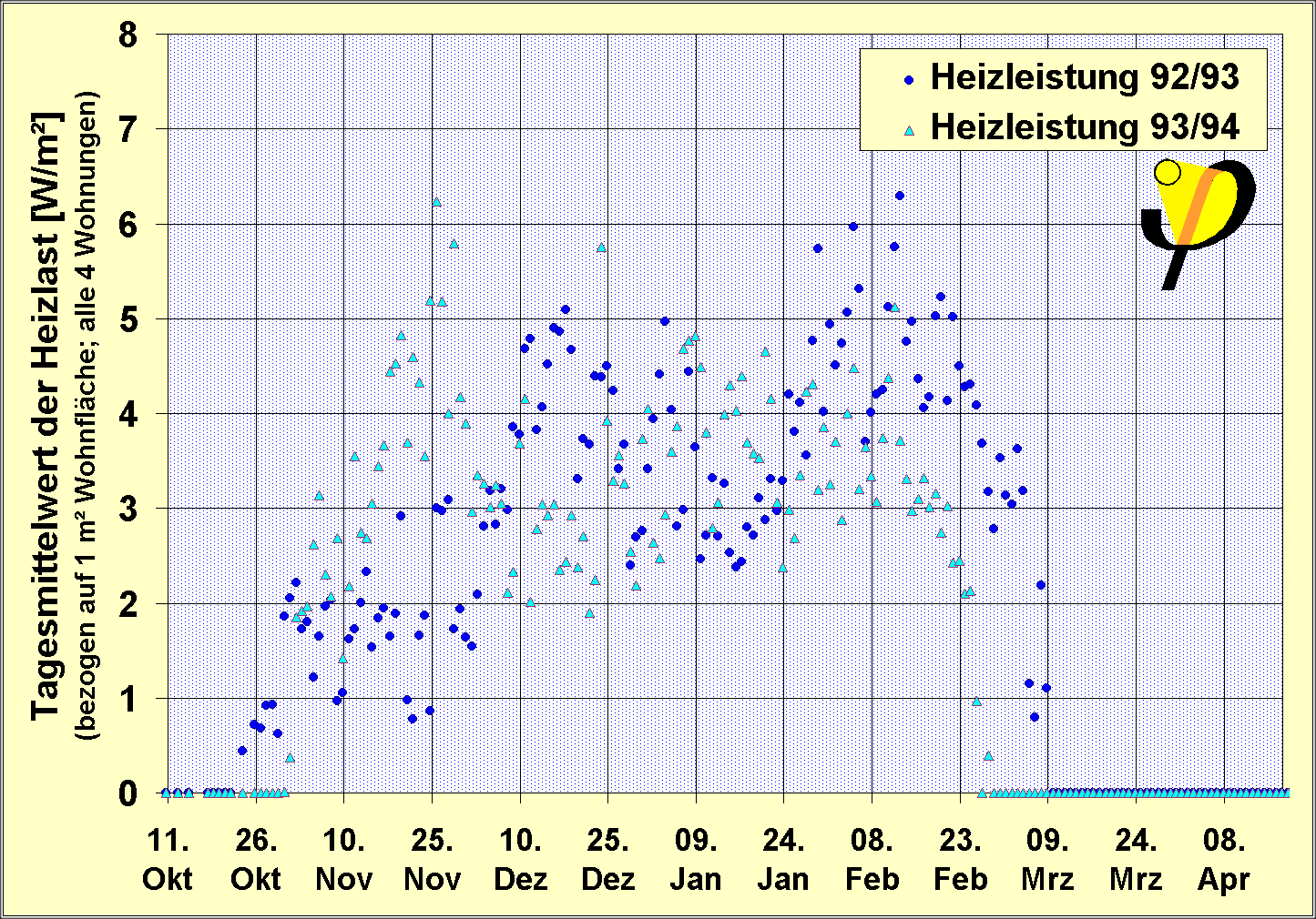 Jedes Symbol in Abb. 8 "Heizlast Darmstadt Kranichstein" repräsentiert einen Tagesmittelwert der gemessenen Heizlast im Passivhaus Darmstadt Kranichstein. Hierbei wurde die Heizlast aller vier Reihenhäuser gemessen und durch die gesamte Wohnfläche geteilt (4 * 156m²). In der Zeit vor Ende Oktober und nach Ende Februar wurde in diesem Gebäude nie geheizt: Der Heizwärmebedarf konzentriert sich auf die Kernzeit des Winters, d.h. November bis Februar. Die gemessene maximale Heizlast war nie höher als 7 W/m². Das ist extrem gering, für eine ganze Wohnung beläuft sich die benötigte Heizleistung auf maximal 1,1 kW.