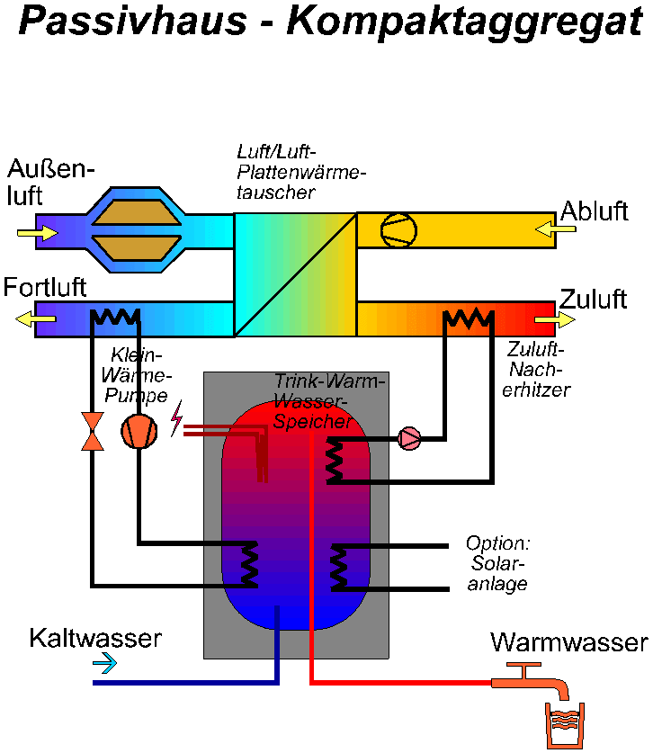 Eine Lüftungsanlage mit Wärmerückgewinnung ist im Passivhaus ohnehin unverzichtbar. Wie schon zuvor gezeigt, reicht dann ein kleiner Nacherhitzer im Zuluftstrang aus, um das ganze Gebäude zu beheizen. Die Wärme für die Zuluftnachheizung kann z.B. aus dem Warmwasserbereitungssystem kommen; die Verhältnisse werden umgedreht: Bisher hat man mit der Heizanlage noch „nebenbei“ Warmwasser bereitet; im Passivhaus kann die geringfügige Restheizung mit der Warmwasserbereitung einfach "nebenbei" erledigt werden.