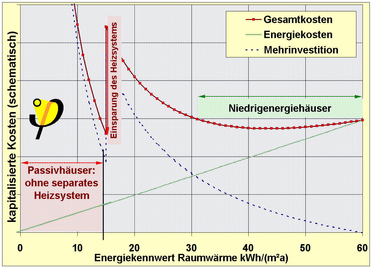 Wenn die Effizienz von Gebäuden durch dickere Dämmung, Passivhaus-Fenster und hocheffiziente Wärmerückgewinnung verbessert wird, so sinkt der Jahresheizwärmebedarf; zugleich steigen aber die Erstellungskosten für das Gebäude (blaue Kurve in Abb. 10). Diese steigen sogar umso mehr, je niedriger der bereits erreichte Verbrauch ist - dies ist als "Gesetz des schwindenden Grenznutzens" bekannt. Auf den ersten Blick scheint es daher keine Chance zu geben, die Heizwärmebedarfswerte mit vertretbarem ökonomischem Aufwand unter etwa 30 kWh/(m²a) zu drücken. Weil dies die weitverbreitete Ansicht der Bauträger in Europa war, gab es nur wenige Versuche, Gebäude mit noch besserem Wärmeschutz zu errichten.