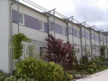 Das Passivhaus-Demonstrationsvorhaben in Darmstadt war so erfolgreich, dass eine Vielzahl von Folgeprojekten einige Jahre später errichtet wurden. Abb. 12 zeigt beispielhaft eine Siedlung mit 22 Passivhäusern, die vom Bauträger Rasch&Partner 1997 in Wiesbaden fertiggestellt wurden. Diese Häuser wurden im kostengünstigen Wohnungsbau errichtet, zu Bauwerkskosten von weniger als 2100 DM/m² (1.074 €).