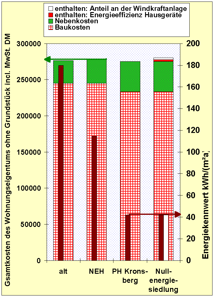 Die Passivhäuser in Hannover Kronsberg wurden dabei in extrem kostensparender Bauweise errichtet; sie waren nicht teurer als neue Niedrigenergiehäuser (Baujahr 1997) am gleichen Standort. Aber in diesem Angebot waren zwei Extras enthalten: