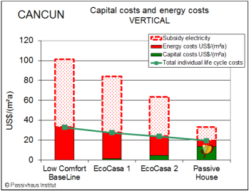 Die Grafik zeigt die Kapital- und Energiekosten eines 6-geschossigen Wohnblocks (Vertical genannt) bei heutigen Preisen. Der Passivhaus-Standard ist schon heute die kosten-optimale Lösung. Dies wird sogar noch deutlicher, wenn man die Strom-Subventionen, die von der mexikanischen Regierung gezahlt werden, berücksichtigt (gestrichelte Balken in der Grafik).